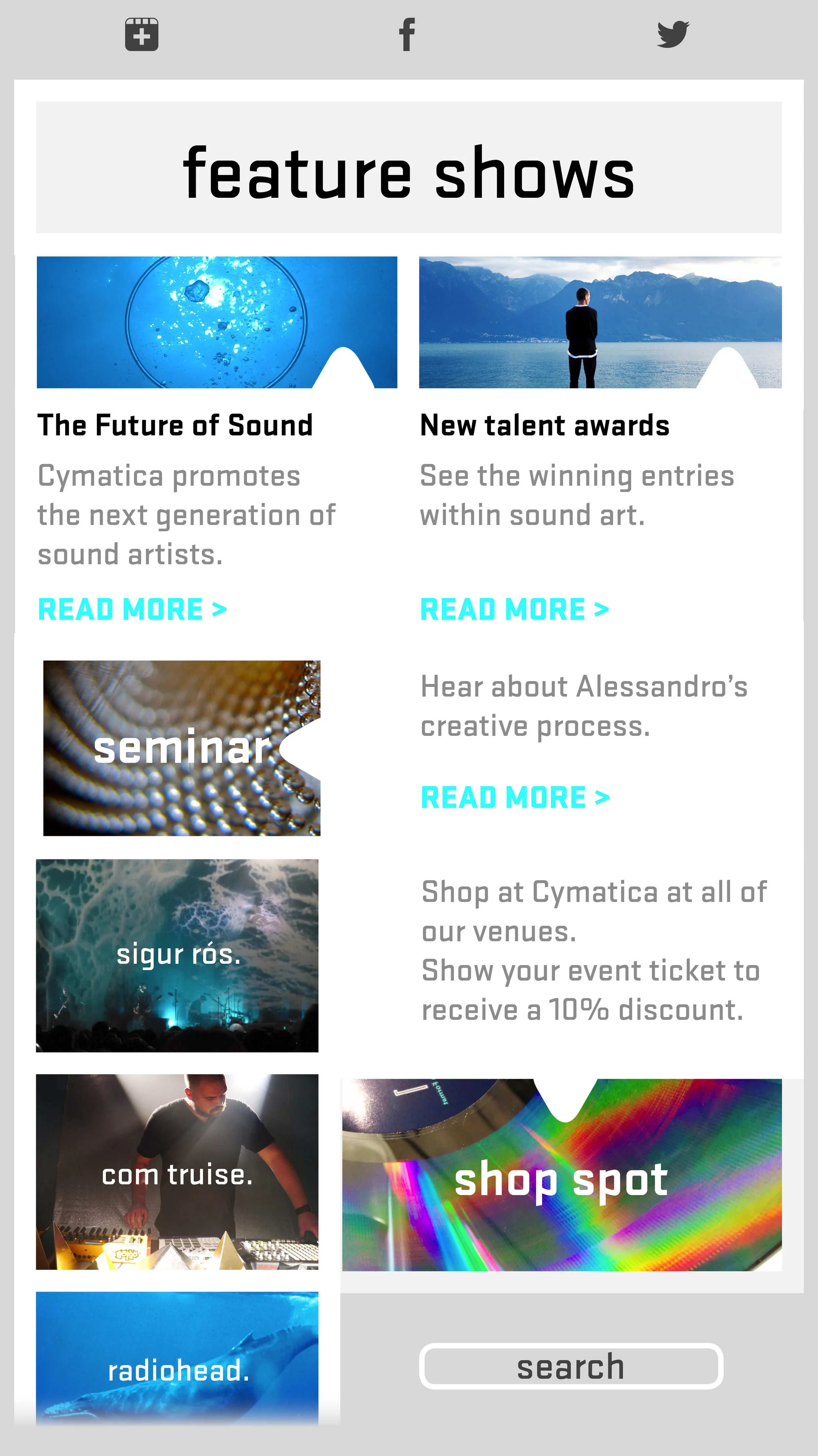 Cymatica is a concept for a festival that blends music, art, and the science of sound for a sublime entertainment experience. Here, I've created a logo, visual identity, and a template for an app guide providing maps, artist bios, and ticket purchase for potential attendees.
